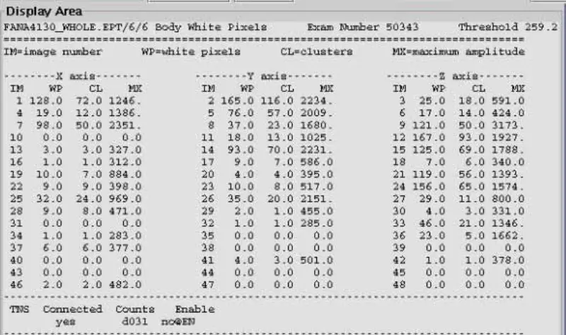 13. Reconectați cablurile DD la Pen Wall. Deconectați cablul BNC Body and Head T/R Bias la SSM.EPT scanarea capului și a corpului cu pixeli albi. Rezultatul este că toate au eșuat. Reconectați cablurile de polarizare a corpului și a capului îndepărtate. Deconectați cablul de ieșire al capului și al corpului pe scanarea pixelilor albi SRFDII.EPT. Rezultatul este că toate au eșuat. S-a confirmat că problema nu este în SRFDII AMP și SSM.