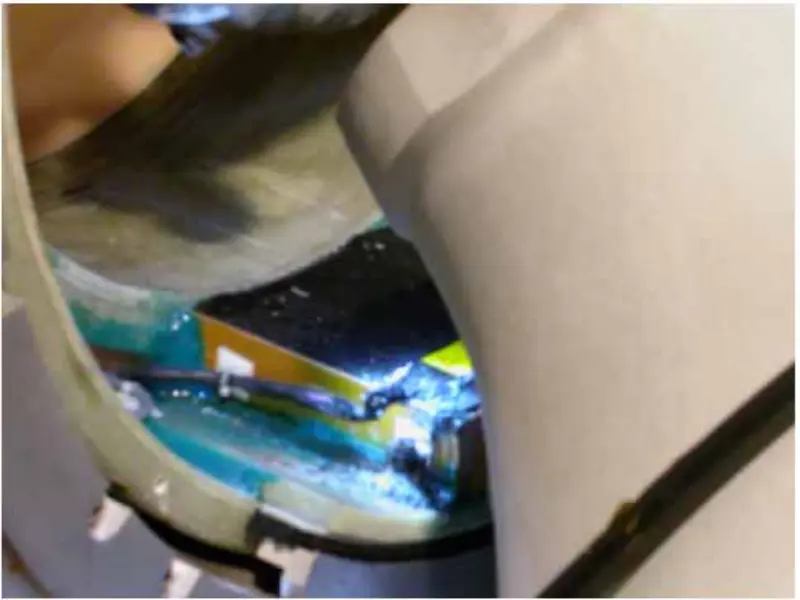 Din acțiunile și analizele de mai sus, concluzionăm că problema ar trebui să fie cauzată de bobina de gradient. Deci scoatem capacul din față și din spate al magnetului, verificăm și strângem șuruburile legate de bobina de gradient. După ce am îndepărtat capacul din spate al magnetului, constatăm că cablul de lame de înaltă ordine a fost ars într-unul negru.